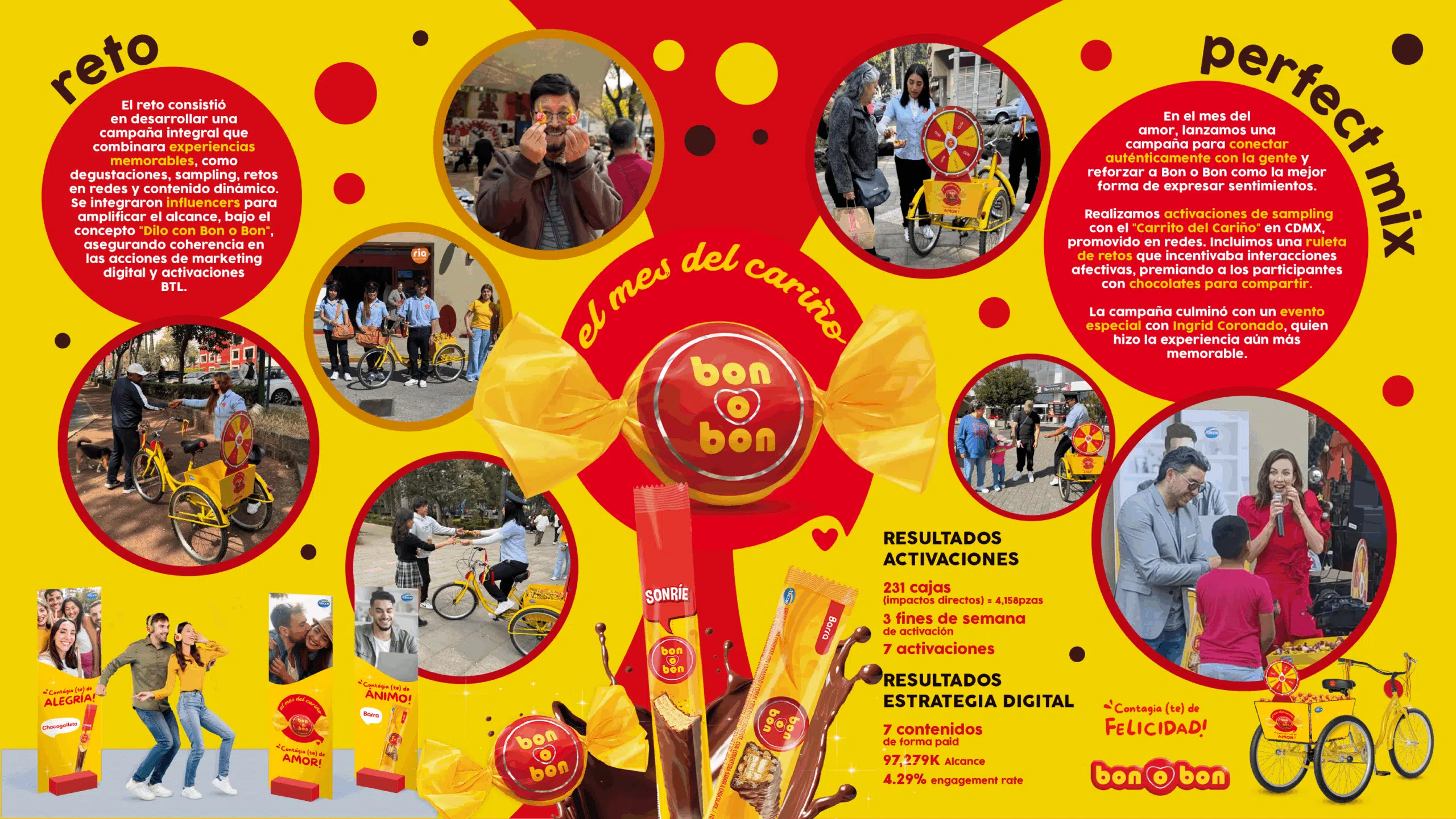 Resultados: Activaciones: 7 eventos, 231 cajas distribuidas (4,158 piezas) en 3 fines de semana. Estrategia digital: 7 contenidos pagos, 97.2K de alcance y 4.29% de engagement rate.