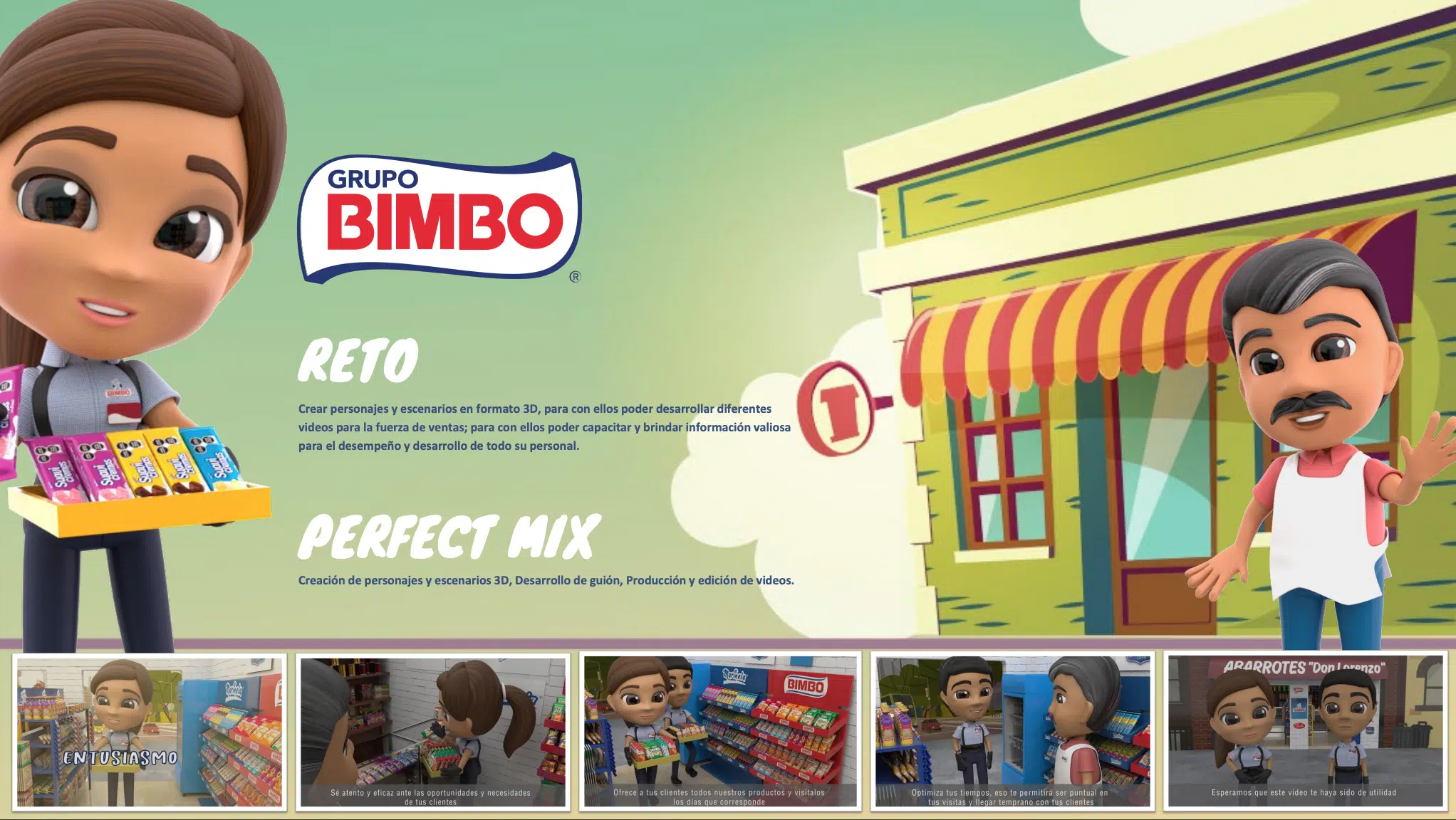Perfect Mix: Incluye la creación de personajes y escenarios en 3D, desarrollo de guiones, producción y edición de videos.