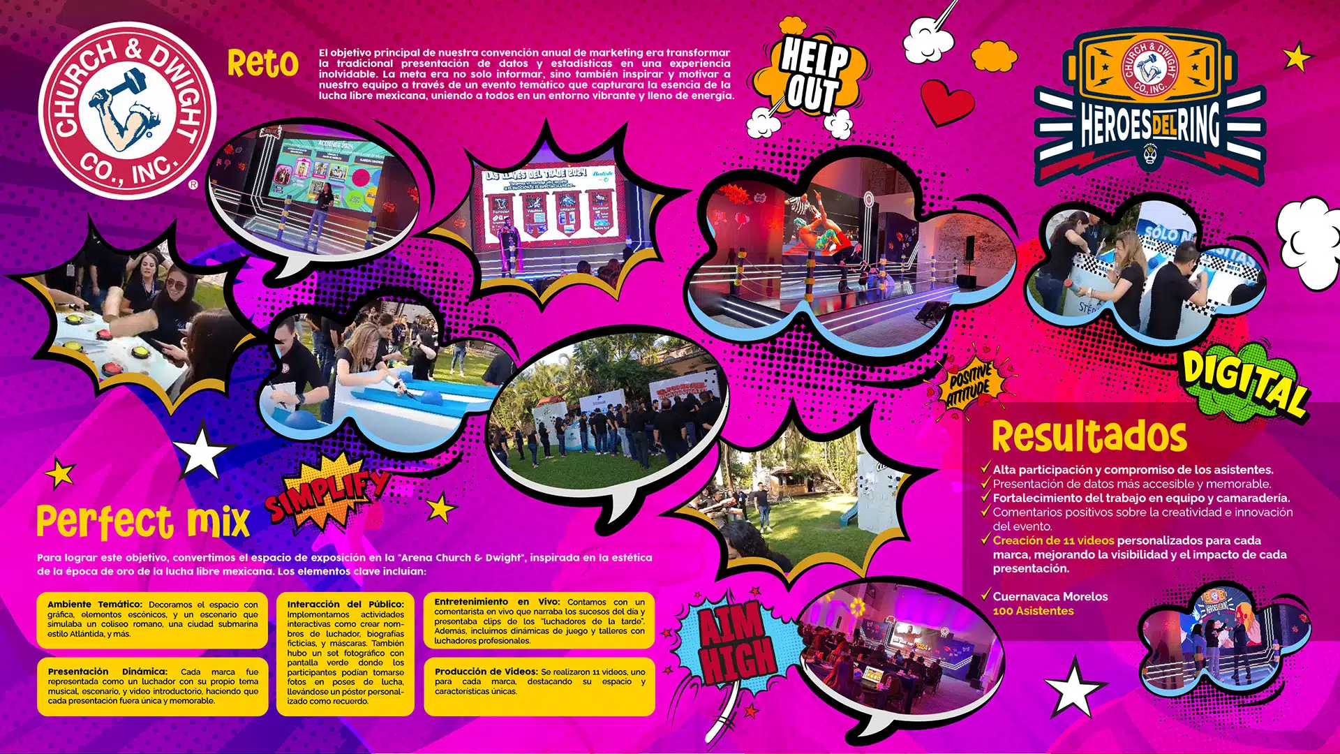 Perfect Mix: Transformamos la “Arena Church & Dwight” en un espectáculo de lucha libre mexicana, con escenografía épica, marcas convertidas en luchadores y presentaciones únicas. Los asistentes crearon su identidad de luchador, participaron en dinámicas y se llevaron fotos personalizadas. Un comentarista narró la acción en vivo, mientras luchadores profesionales ofrecieron talleres. Además, se produjeron 11 videos para destacar cada marca, haciendo del evento una experiencia inolvidable.