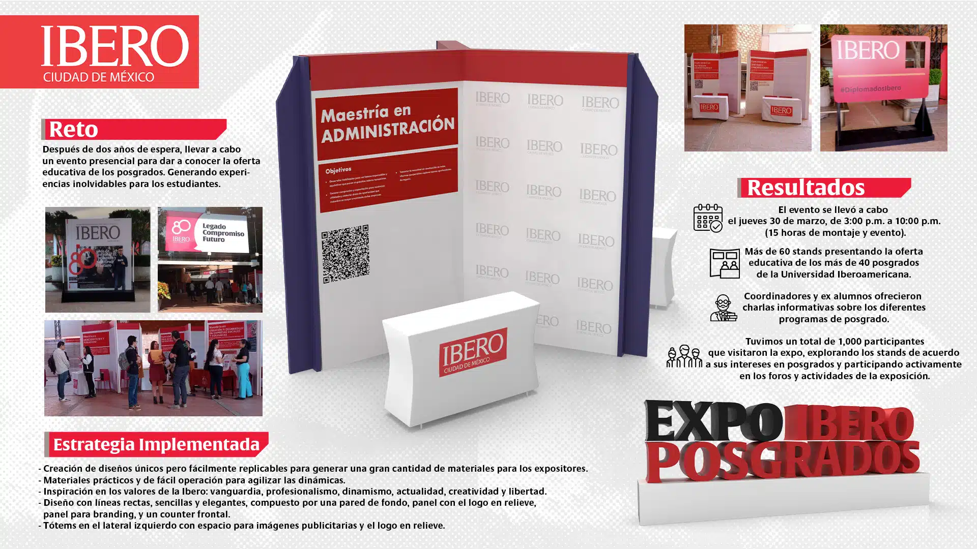 El reto consistía en organizar el evento más esperado por los estudiantes de manera presencial después de dos años, motivando su participación en actividades y posgrados para crear una experiencia conectiva e inolvidable. La estrategia incluyó la creación de diseños únicos pero replicables para materiales de expositores, con inspiración en los valores de la Ibero y un diseño sencillo y elegante. Se contó con más de 60 stands presentando la oferta educativa de los posgrados y charlas informativas.