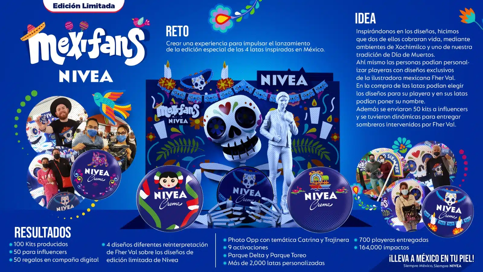 En resumen, se produjeron 100 kits en total, se entregaron 50 a influencers, se distribuyeron los 50 restantes en una campaña digital, se crearon 4 diseños reinterpretados por la artista basados en las latas de edición limitada de NIVEA, se realizaron 9 activaciones en Parque Delta y Parque Toreo, se adquirieron más de 2,000 latas personalizadas, se entregaron 700 playeras personalizadas durante las activaciones, y la campaña alcanzó un impacto total de 164,000 personas.
