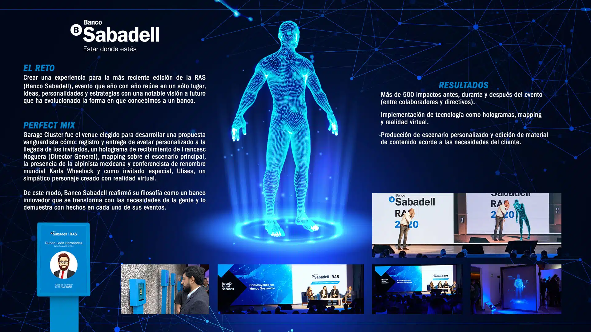 El desafío consistía en crear una experiencia innovadora para la edición más reciente de la RAS (Banco Sabadell), un evento que anualmente reúne a líderes, personalidades y estrategias con una visión futurista en la industria bancaria. El evento se llevó a cabo en el Garage Cluster y se destacó por ofrecer un registro con entrega de avatares personalizados, un holograma de bienvenida de Francesc Noguera (Director General), mapping en el escenario principal, la participación de la alpinista y conferencista Karla Wheelock, y la presencia especial de Ulises, un personaje creado con realidad virtual. Esta iniciativa reafirmó la filosofía de Banco Sabadell como un banco innovador que se adapta a las necesidades de su público.