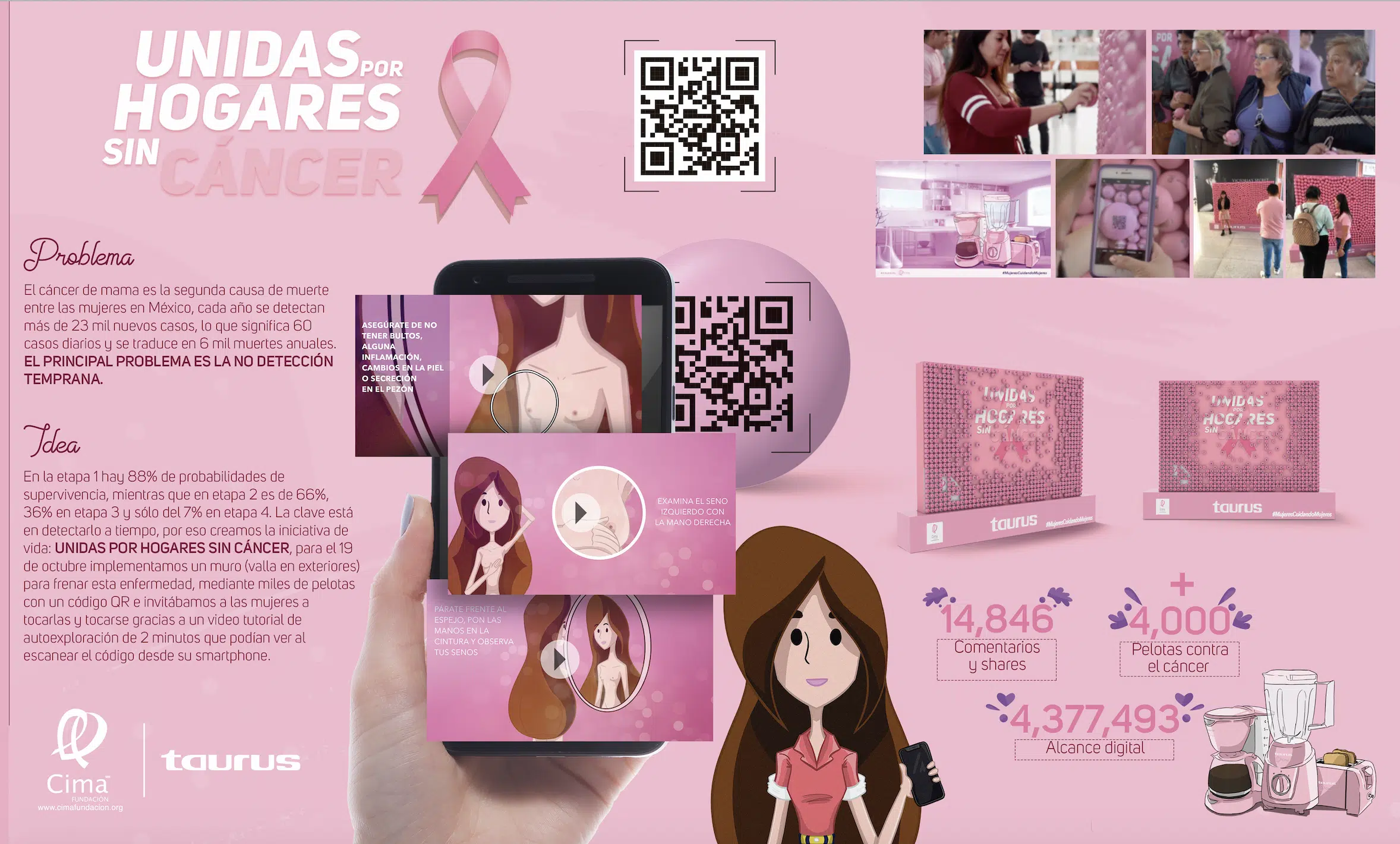 Idea: En la etapa uno, hay un 88% de probabilidades de supervivencia, mientras que en la etapa 2, la cifra desciende al 66%, en la etapa 3 al 36%, y en la etapa 4, es tan solo un 7%. La clave está en detectarlo a tiempo, por lo que creamos la iniciativa “Unidas por Hogares Sin Cáncer”. Para el 19 de octubre, implementamos un muro publicitario en exteriores con miles de pelotas, cada una con un código QR. Invitamos a las mujeres a tocar las pelotas y recordarse a sí mismas la importancia de la autoexploración mediante un vídeo tutorial de 2 minutos, accesible al escanear el código desde sus smartphones.