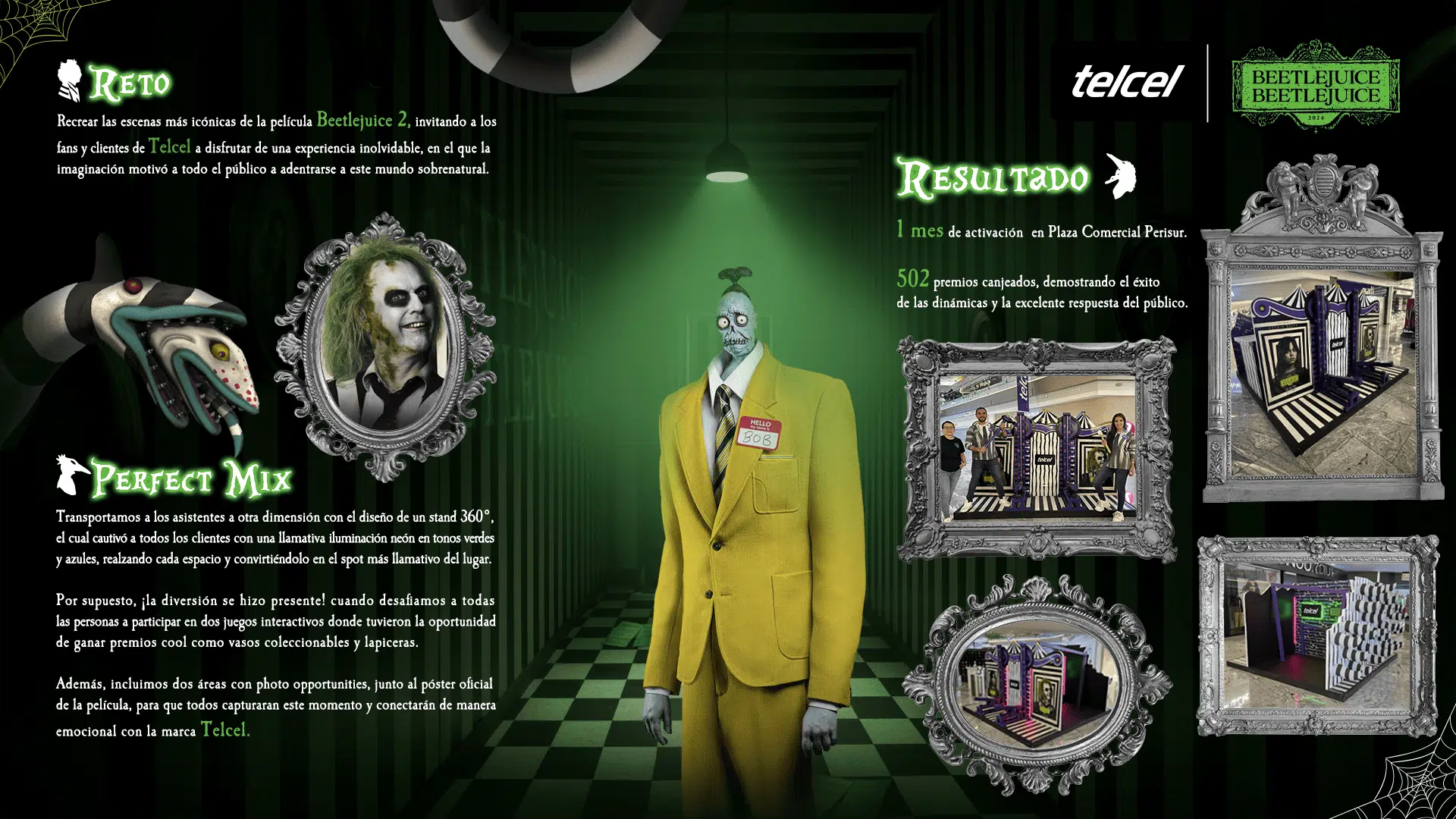 Reto: Crear una experiencia inmersiva para que los clientes de Telcel vivan el mood de Beetlejuice, disfrutando sus escenas más icónicas con un toque paranormal y mucha diversión.